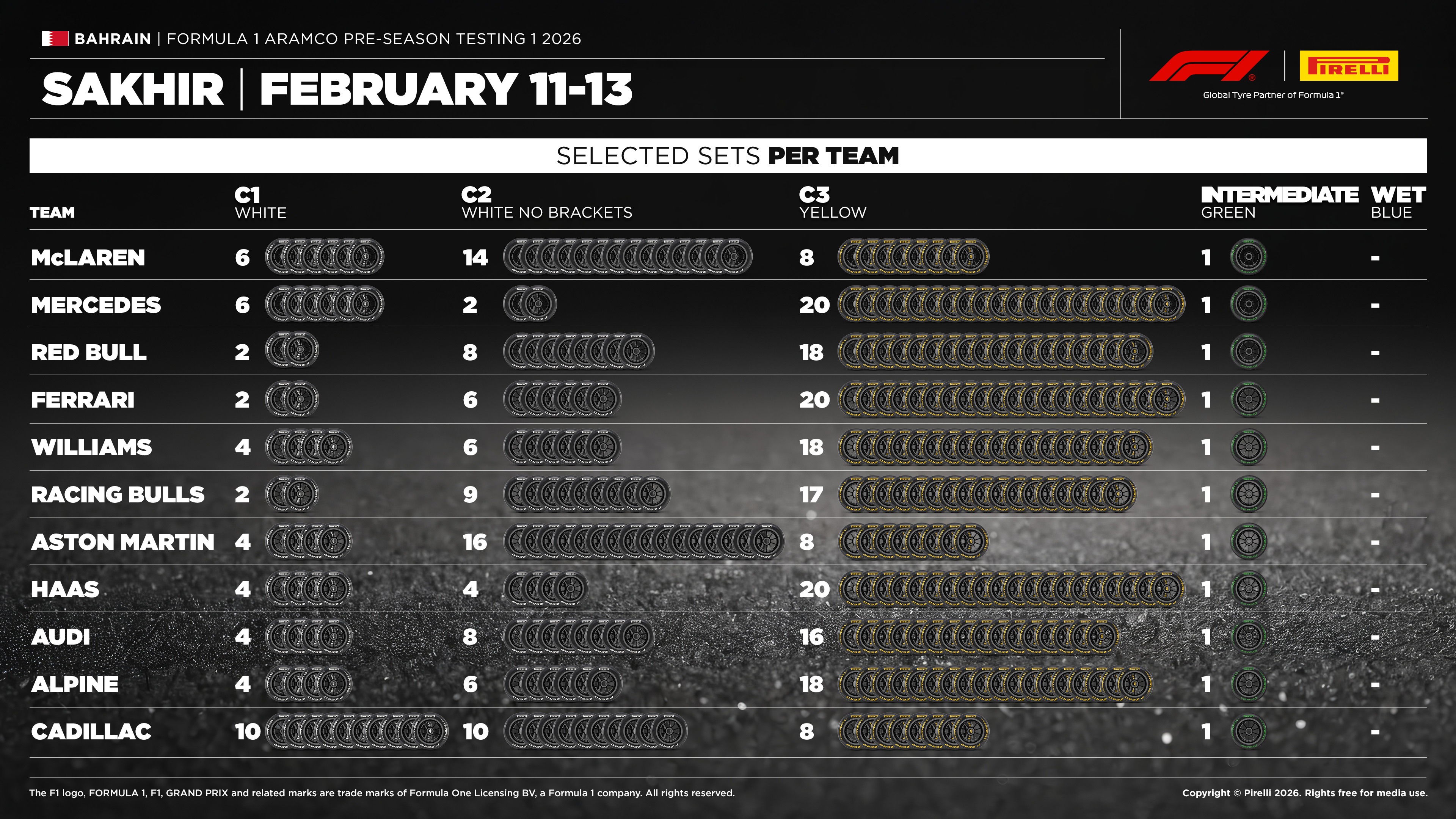 A lényeg azonban az, ki hány szettet kért az adott keverékekből, mert ebből lehet következtetni arra, ki mire helyezi majd inkább a hangsúlyt a hét folyamán. A C1-es, vagyis a legkeményebb abroncsból mindenki legalább két szettet kért (Red Bull, Ferrari, Racing Bulls), a többség négyet (Williams, Aston Martin, Haas, Audi, Alpine), majd két további istálló hatot (McLaren, Mercedes), a Cadillac pedig egyedüliként tízet.
